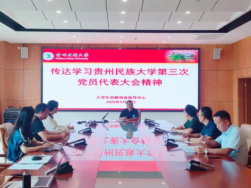 2025年9月30日,贵州民族大学大学生创新创业指导中心组织全体人员,联合贵州深投创业孵化投资有限公司人员,于南校区A3栋五楼会议室开展“传达学习贵州民族大学第三次党员代表大会精神”专题学习会。会议由中心主任王长城主持,围绕9月28日-29日党代会核心内容,结合中心工作实际,深化对报告精神的理解与实践转化。