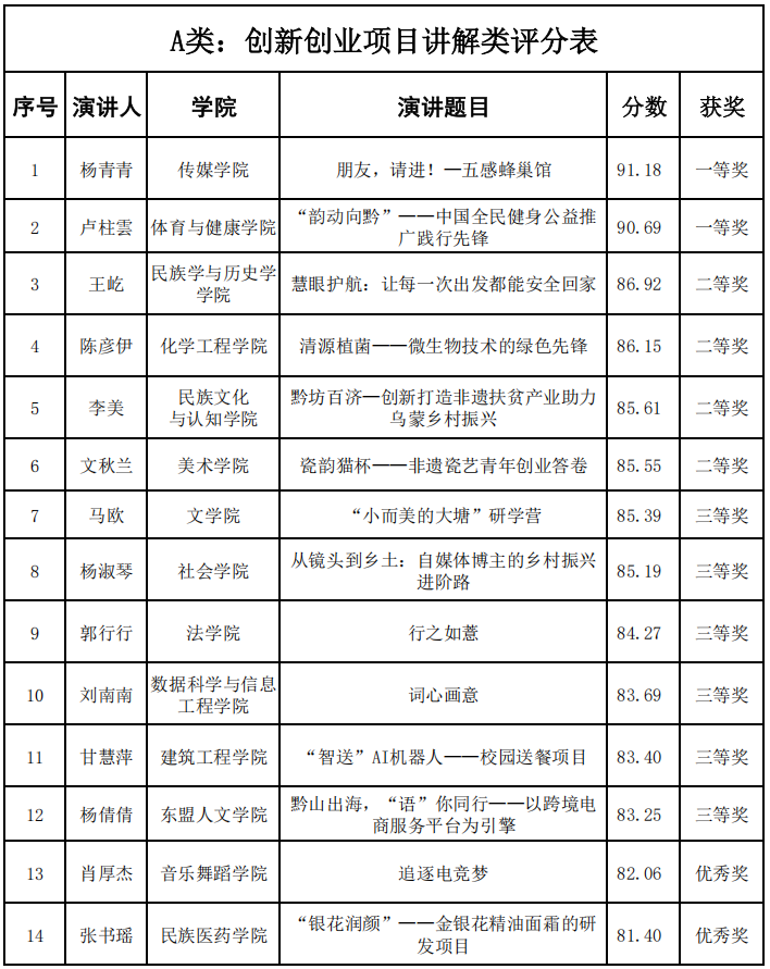 2025年11月24日,贵州民族大学2025年大学生创新创业演讲比赛在南校区A3栋五楼会议室顺利举行。本次比赛由学校教务处、校团委、学工部及大学生创新创业指导中心联合举办,旨在激发学生创新创业热情,提升项目路演与表达展示能力,营造校园创新创业文化氛围。