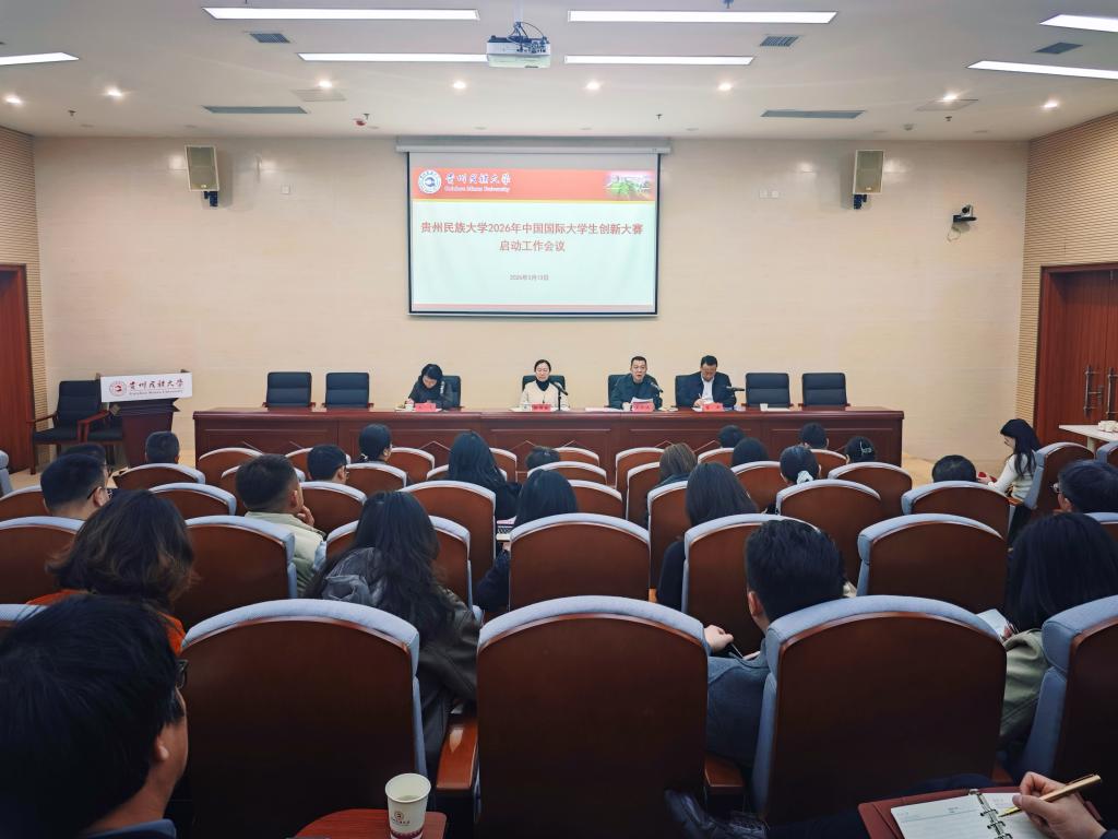2026年3月13日下午,贵州民族大学2026年中国国际大学生创新大赛启动部署会在南校区行政楼一楼报告厅召开。校党委常委、副校长徐国敏出席会议并讲话,大学生创新创业指导中心副主任雷邦主持会议,大学生创新创业指导中心主任、学生处副处长王长城作专题发言。各学院分管双创教育的领导、双创工作联络员,教务处领导及双创中心全体工作人员参会。