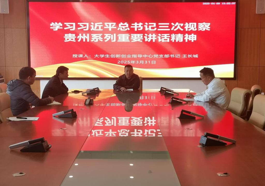 为深入学习贯彻习近平总书记三次视察贵州重要讲话精神,2025年3月31日,大学生创新创业指导中心党支部书记为支部党员讲授党课,深刻领会总书记重要讲话的丰富内涵与实践要求,切实将思想和行动统一到党中央决策部署上来。