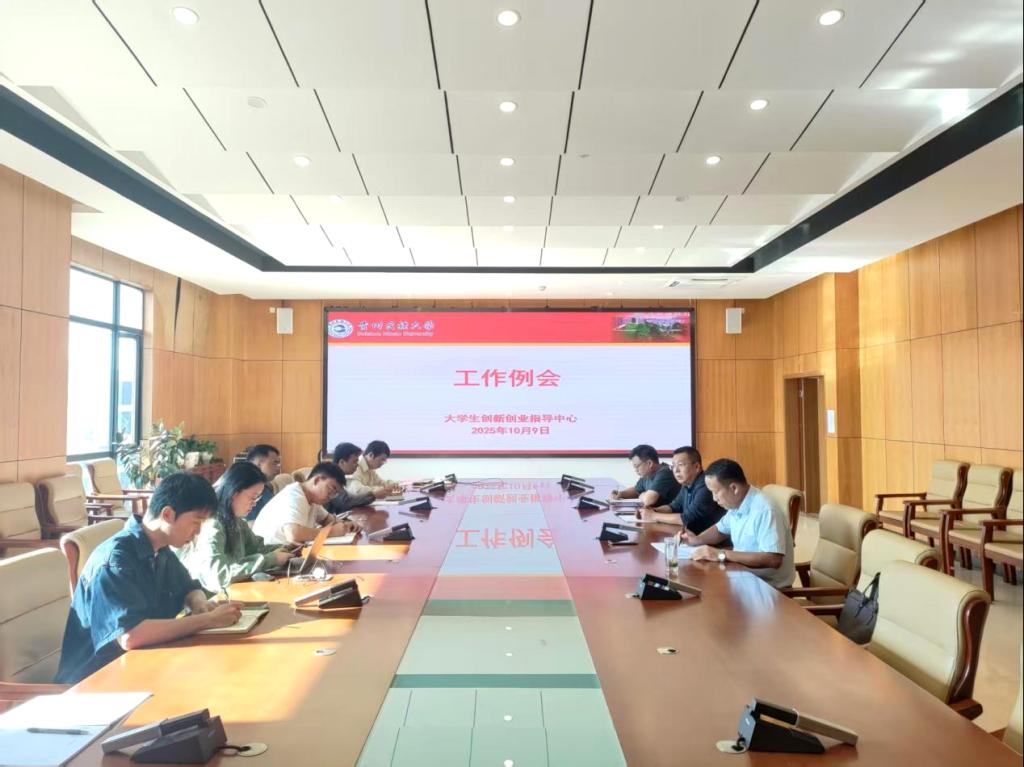 2025年10月9日,大学生创新创业指导中心于南校区A3栋五楼会议室召开第二十次工作例会。会议由王长城主任主持,中心全体成员参与,“黔民筑梦”众创空间运营方—贵州深投创业孵化有限公司人员列席会议。