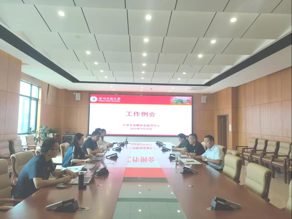 2025年9月30日,大学生创新创业指导中心于南校区A3栋五楼会议室召开第十九次工作例会。会议由王长城主任主持,中心全体成员参与,“黔民筑梦”众创空间运营方—贵州深投创业孵化有限公司人员列席会议。