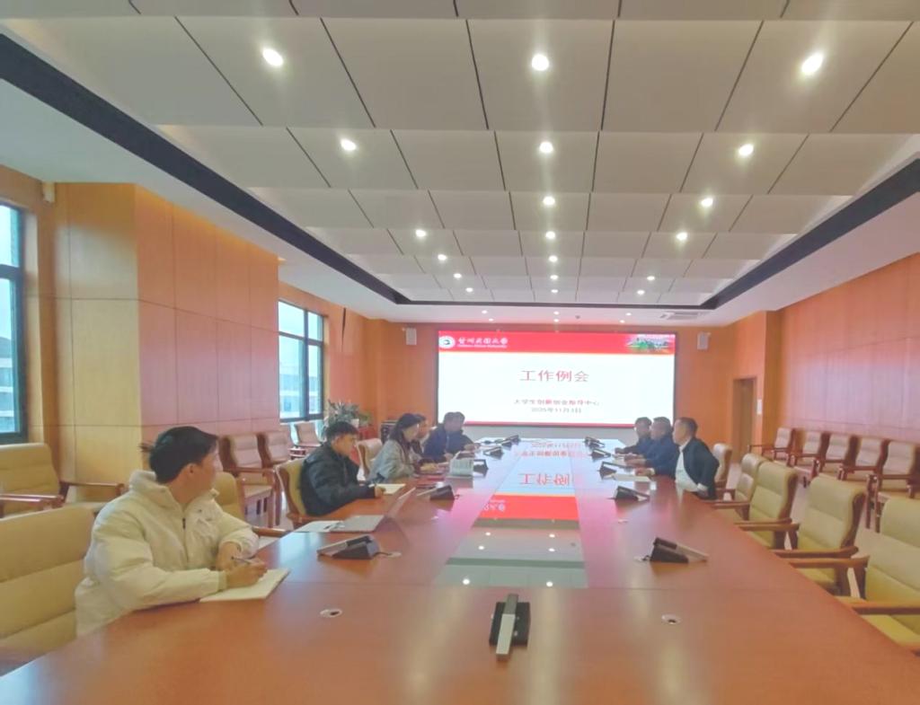 2025年11月3日,大学生创新创业指导中心于南校区A3栋五楼会议室召开第二十三次工作例会。会议由王长城主任主持,中心全体成员参与,“黔民筑梦”众创空间运营方—贵州深投创业孵化有限公司人员列席会议。