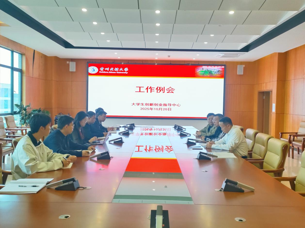 2025年10月20日,大学生创新创业指导中心于南校区A3栋五楼会议室召开第二十一次工作例会。会议由王长城主任主持,中心全体成员参与,“黔民筑梦”众创空间运营方—贵州深投创业孵化有限公司人员列席会议。